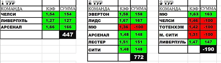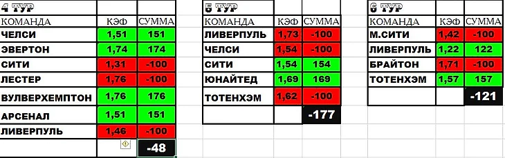 Как мы видим, если брать из игрового дня лишь матчи с явным фаворитом и не стыдясь мелких коэффициентов, можно получить небольшой плюс. Шугает третий тур. Мы поставили 5 сотен, три из них прогорели, спасибо Челси и остальным. И какова чистая прибыль за первые три тура: (147 + 172 -190 = 129) А составляет она: +129. Идем дальше.