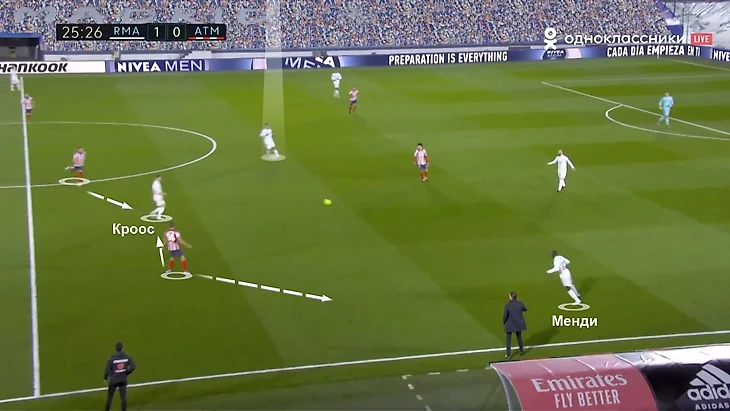 В момент перед переводом Тони Кроос находит даже не в центре, а на левом фланге. Вся тройка полузащиты «Атлетико» стянулась в эту часть поля: