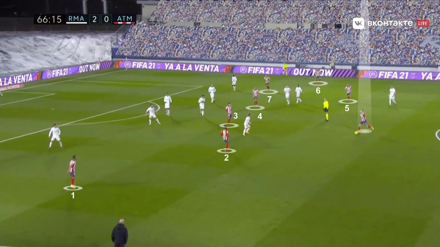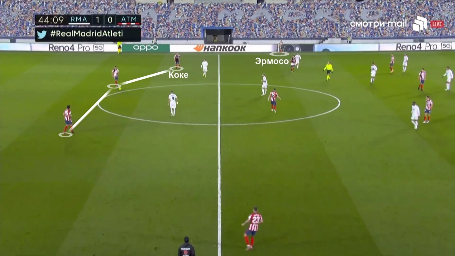 Проблема была и структурной («Атлетико» просто не готовился к ситуации, где нужно много прессинговать), и индивидуальной (например, даже без правильной структуры можно было лучше отыграть в эпизоде выше – Феликс мог хотя бы попытаться накрыть Каземиро).
