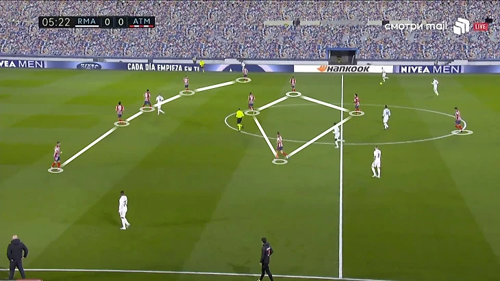 Такой расклад давал «Мадриду» полный контроль. Пятерка защитников «Атлетико» сдерживала атакующую тройку «Реала»; следовательно, в стадии розыгрыша у «Реала» возникали неизбежные преимущества, которые еще умножались на неготовность соперника оказывать активное давление.