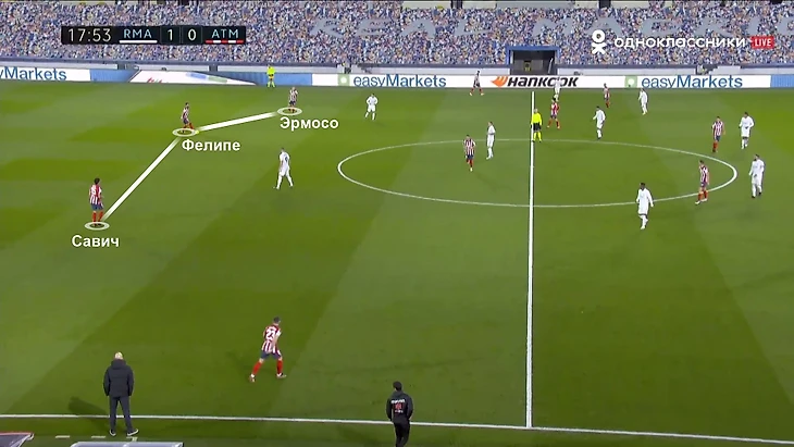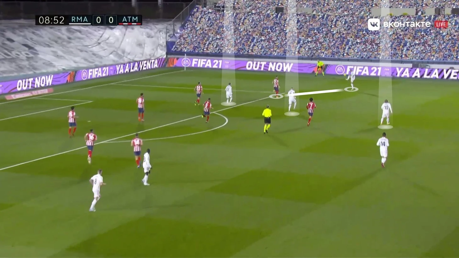 Перевод – Карвахаля поддерживают Васкес и Бензема (при необходимости еще Модрич). Футболисты «Атлетико» теперь играют с маленьким опозданием в каждом следующем микро-эпизоде: