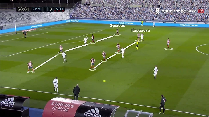 7. Еще до конца первого тайма «Атлетико» перешел на привычные 4-4-2 – Карраско действовал как левый вингер, а Эрмосо стал левым защитником: