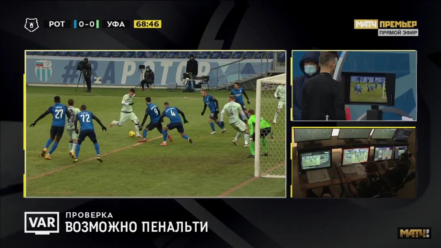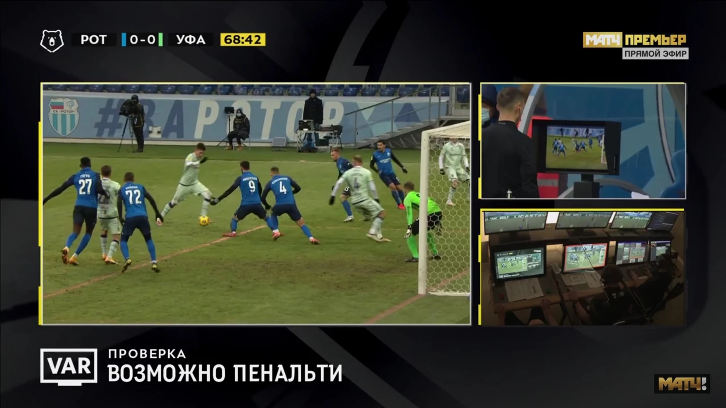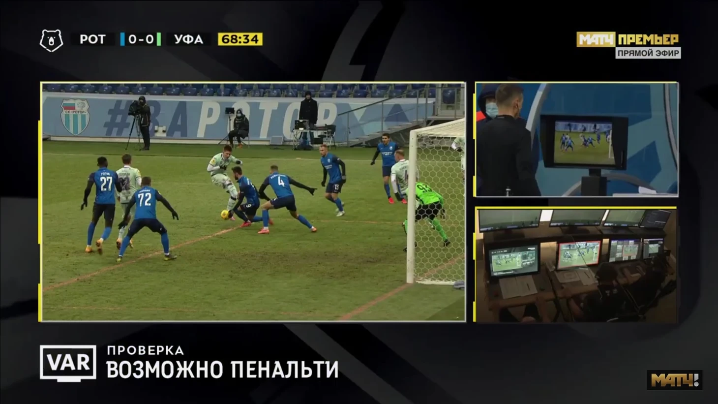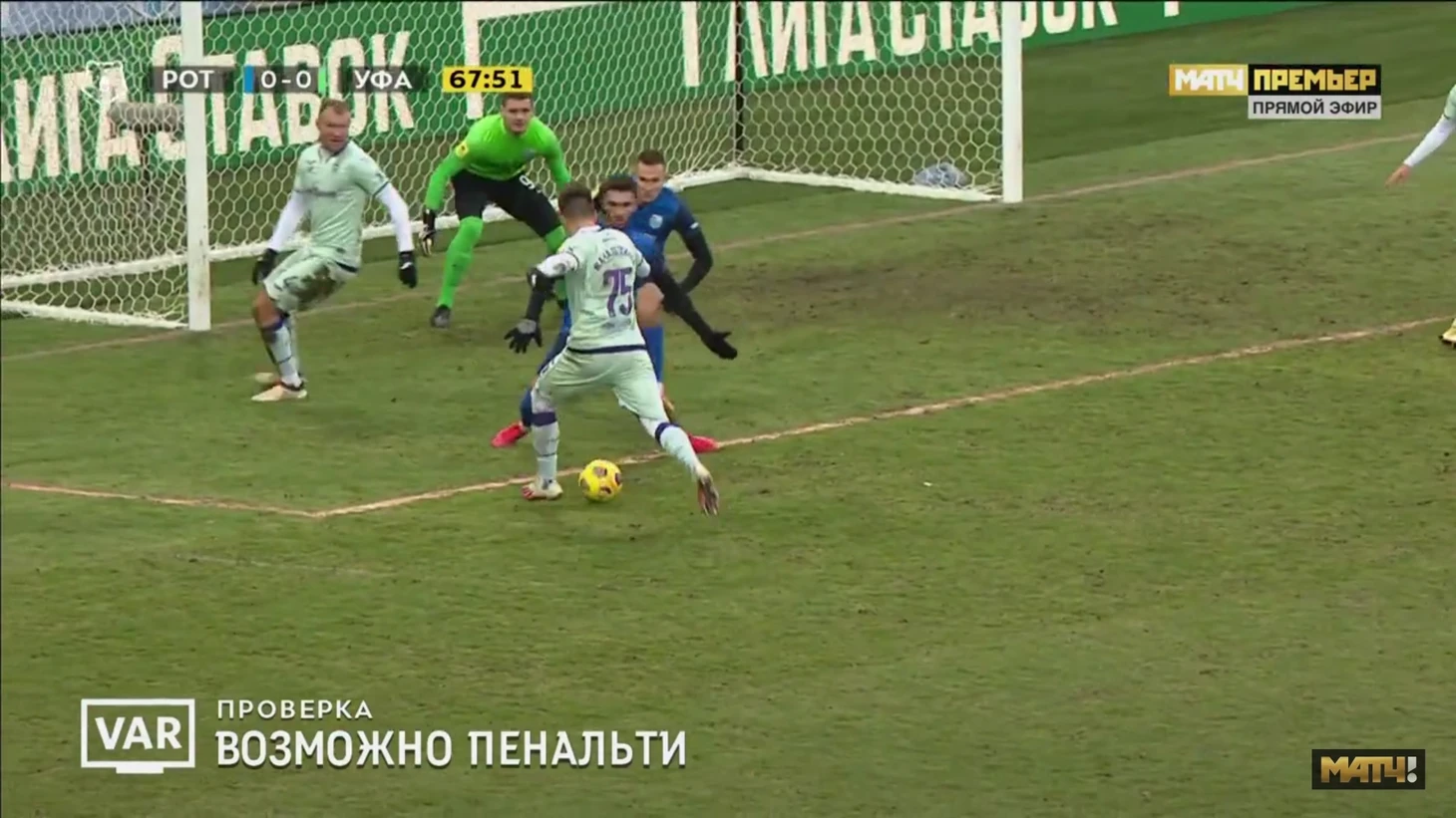 Вывод после просмотра: Игрок Ротора под номером 9, на начало эпизода отбросил руку на недопустимое расстояние от тела, при возможном контакте с мячом в этом положение, защищающая команда наказывается одиннадцати метровым штрафным ударом. Видя, что игрок команды Уфа, начинает замах ноги для технического действия с мячом, он начинает возвращать руку в игровой контур и совершает маневр телом для блокировки возможной траектории полёта мяча. Атакующий футболист производит действие с мячом на минимальном расстояние от обороняющегося, после чего мяч попадает в руку игрока Ротора, меняет траекторию и доходит до партнёра атакующего футболиста.