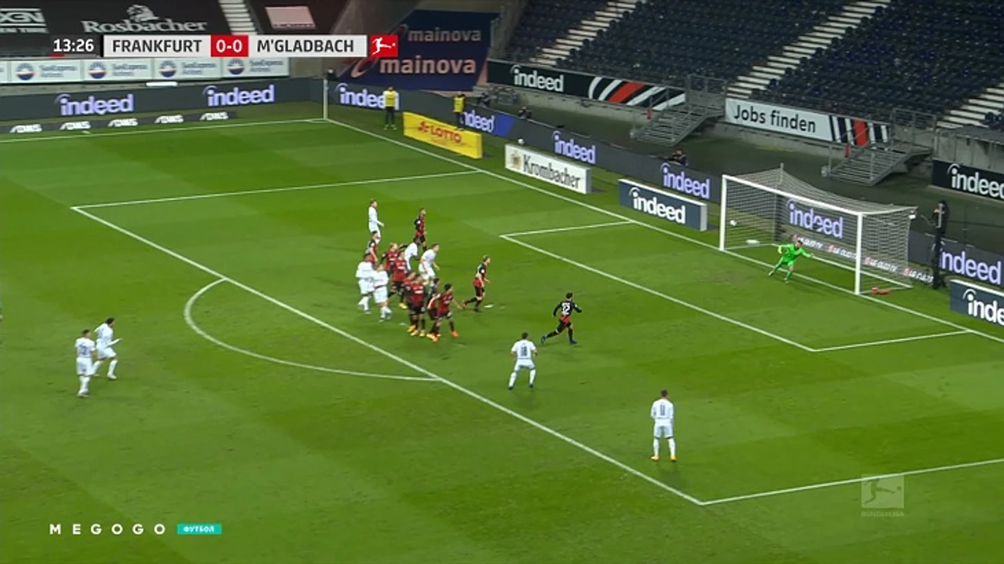 Последняя атака «Боруссии». Траоре навешивает – Штиндль бьет головой с отскоком от газона. Но Трапп ногой цепляет мяч и запускает свечу над штрафной.
