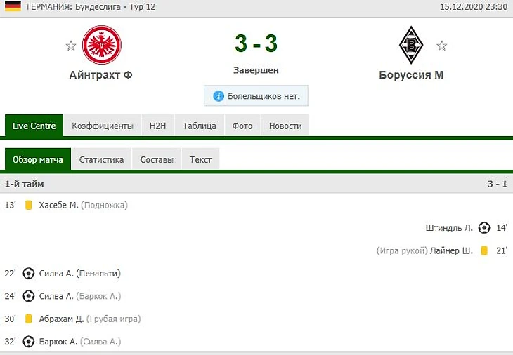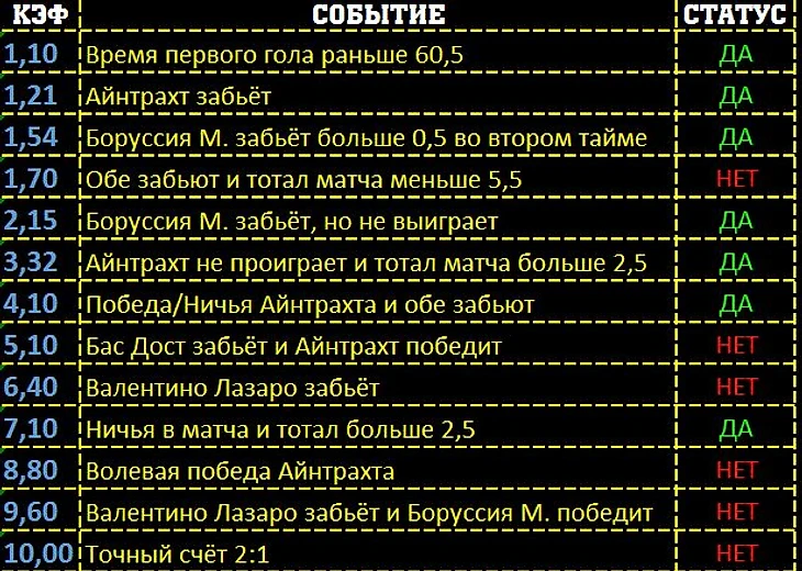 Боруссия Мёнхенгладбах забьёт, но не выиграет, за 2,15; Айнтрахт не проиграет и тотал матча больше 2,5 за 3,32; Победа/ Ничья Айнтрахта и обе забьют за 4,10. После первого гола Боруссии и ответки на её Айнтрахтом - тремя мячами, становилось яснее, что Боруссии победы не видать, и Айнтрахт вроде бы мог свое не упустить. А по мимо этого, команды успели пробить тотал больше 2,5, и каждый естественно забил по своему голу, а значит зашли прогнозы на коэффициенты 2, 3 и 4.