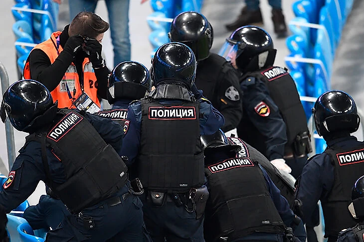 Сотрудники в шлемах и с дубинками (обычно они дежурят на подходах к стадиону и не показываются в чаше) вошли на сектор буквально в тот момент, когда туда же заходили фанаты «Зенита». ОМОНовцы организовали цепочку с нужной стороны и не оставили домашним фанатам дороги к гостевым.