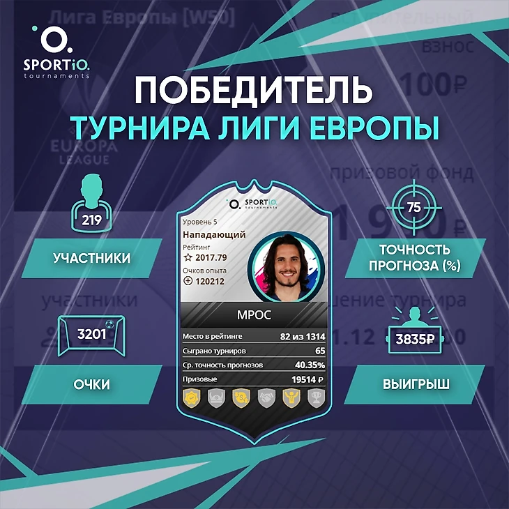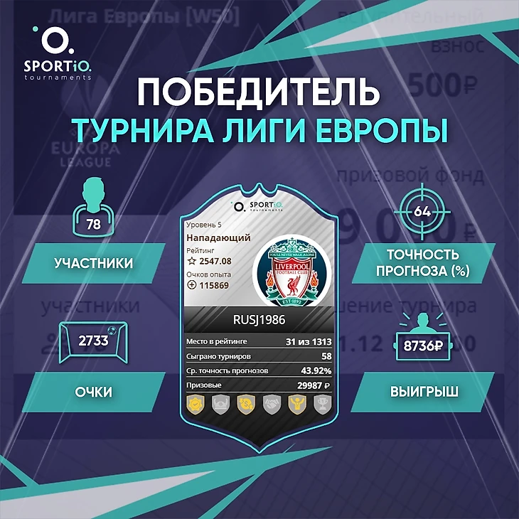 В турнирах Лиги Европы победу одержали: Rusj1986 (выигрыш: 8736₽) и MPOC (выигрыш: 3835₽).