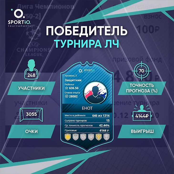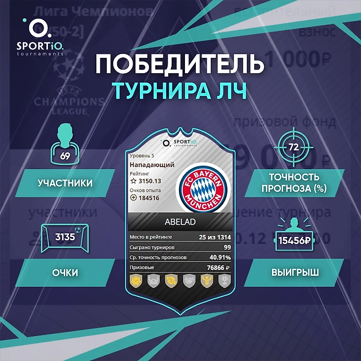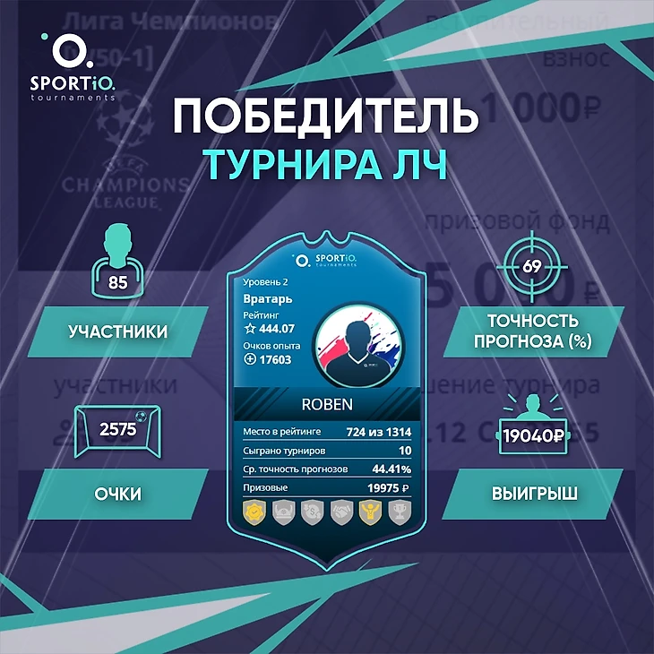 Победителями турниров ЛЧ со взносом 1000₽ стали: abelad (выигрыш: 15456₽) и RoBeN (выигрыш: 19040₽).