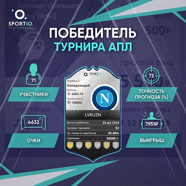 В «Турнире АПЛ» топ-1 взял Lvkuzn, его выигрыш составил 7951₽!