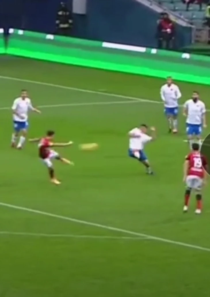 Теперь приходим к выводу. Первую и вторую фазу определяем по фото 1,2. Первая фаза начала движения мяча (игрок кладёт корпус подстраивается под траекторию полёта мяча, бьющая сторона это внешняя сторона левой стопы). Вторая фаза видим что удар, технически выполнен чётко, мяч начинает движение в сторону левого угла ворот на высокой скорости. В первой и второй фазе, игрок в белой футболке совершает резкий выброс тела в сторону коридора полёта мяча, следовательно телу придана скорость, что повышает силу любого контакта.