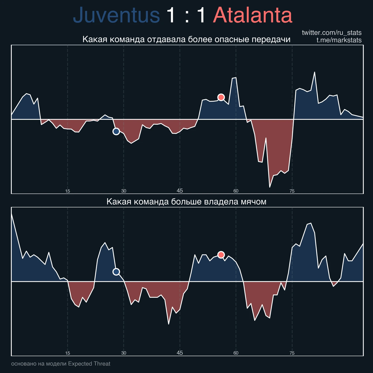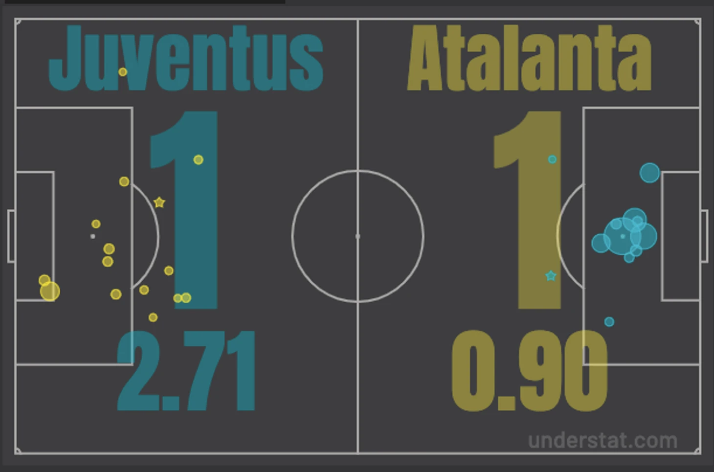Оба гола лишь частично вытекали из хода игры и были забиты в переходных фазах с практически идентичных точек. Два точных дальних выстрела весом 0,03 XG добавили красоты в этот матч. Исходя из обшей опасности, созданной командами, Ювентус больше наиграл на победу. Но можно сказать, что подопечные Гасперини вернули должок за прошлое противостояние.