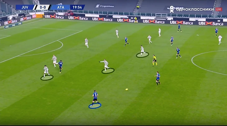 Игра началась достаточно предсказуемо. Ювентус строил атаки короткими розыгрышами, а Аталанта в своей классической манере старалась их высоко накрывать. Но было несколько нюансов. В первую очередь структура билд-апа 3-1 (иногда и 4-2) от бьянконери оставляла свободного игрока для передачи. Трезубец бергамасков (пусть и не в оптимальном составе, но все равно очень сыгранный) мог накрывать только двух центральных защитников и опорника. Конечно, благодаря перестроениям гостей свободный игрок быстро попадал под давление, но все же секунды для принятия решений имелись.