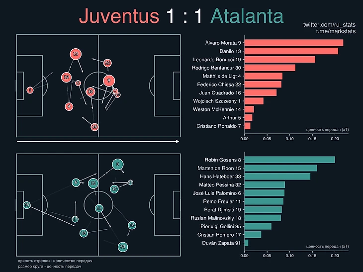Высокие показатели по xT у Данило и Бонуччи в составе хозяев и у Гозенса с Хатебуром в составе гостей косвенно показывают, как чаще всего развивались атаки у команд.