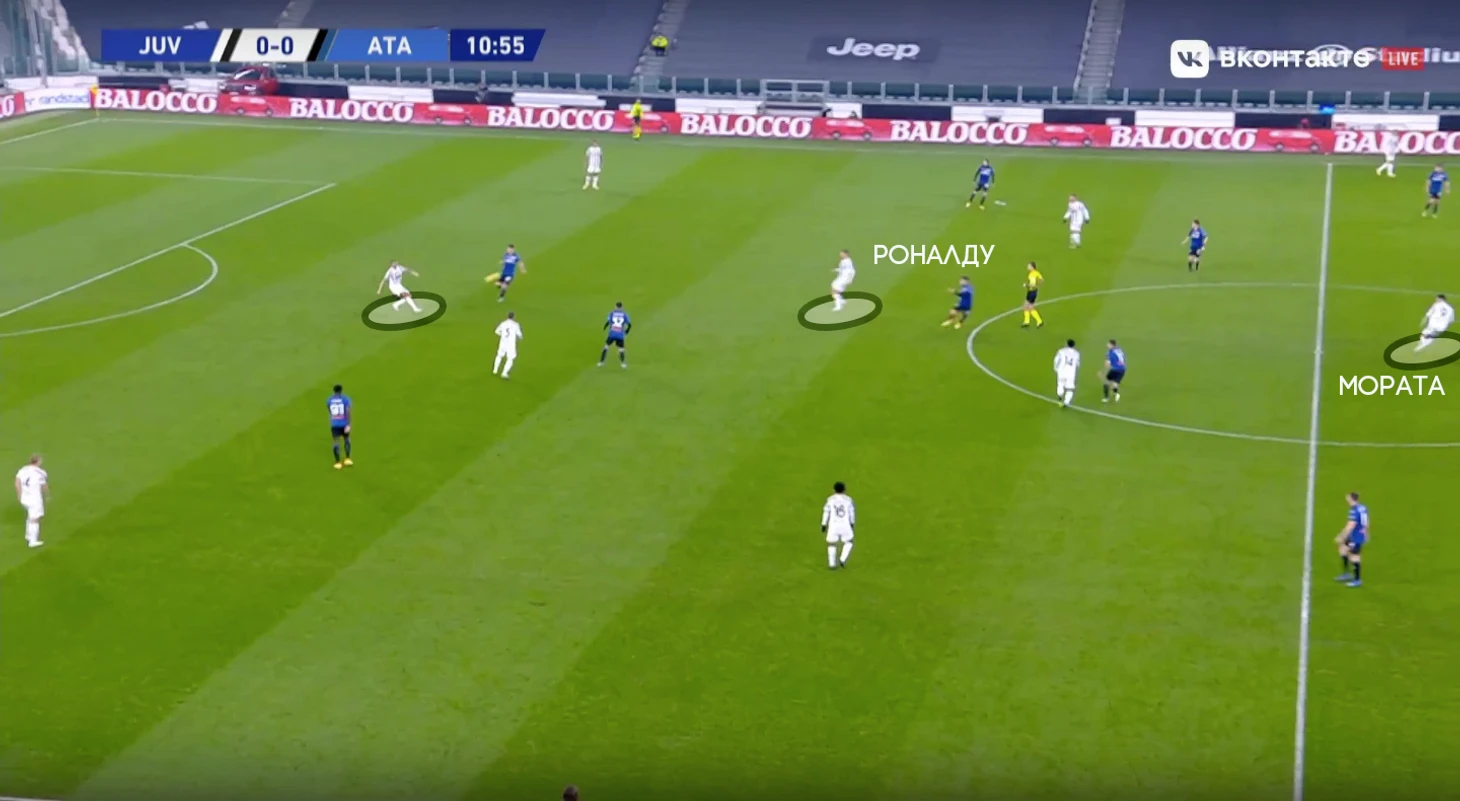 У Ювентуса после короткого розыгрыша, поднимающего линию обороны Аталанты, следовало вертикальное продолжение: либо заброс за спину защитникам, либо пас в недодачу кому-то из отскочивших игроков линии атаки. По ходу этого сезона Мората и Роналду отлично отладили взаимодействие в связке. Они хорошо чувствуют друг друга и понимают, в какой тайминг нужно отскочить или сделать рывок за спину. Причем оба могут выступать в любой роли.