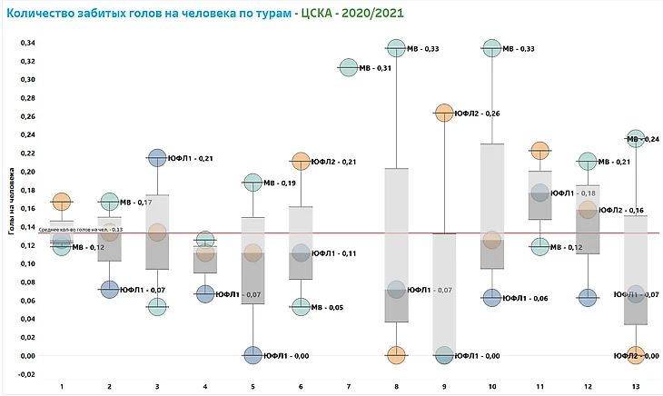 Движемся дальше, меняем визуализацию, а то уже от столбиков в глазах рябит :) Но, у некоторых ещё сильнее зарябит от бокс-плотов :) Если вам сложно трактовать и читать эту визуализацию, то у нас есть специальный пост в меню в группе, посвящённый этой замысловатой, но при этом очень показательной визуализации. Итак, анализируем армейцев по итогам 1-ого круга сезона 2020/2021 в разбивке по лигам и по турам. Каждый бокс-плот это тур, снизу есть соответствующий цифирь, а каждый шар внутри бокс-плотов это лига: ЮФЛ1, ЮФЛ2 или Мб. Анализируем данные через призму относительного показателя, а именно голы на человека, именно такой подход позволит нам более корректно сравнивать лиги исключая колебания по кол-ву игроков в командах. Итак, отмечаем, что в начале сезоне в 1-м туре наиболее эффективной была команда ЦСКА в ЮФЛ2 - 0,17 голов на игрока, во 2-м туре уже Мв - 0,17 голов, в 3-м туре вовсе ЮФЛ1 - 0,21 голов на человека. Но, начиная с 7-ого тура наиболее эффективной командой в структуре ЦСКА является Мв, лишь в 9-м и 11-м туре их обошли из ЮФЛ2. Как мы отмечали выше в МРПЛ у армейцев всё гораздо веселее, чем в ЮФЛах. Если сравнивать ЮФЛ1 и ЮФЛ2 между собой, то обратите внимание, что ЮФЛ1 редко когда поднимается выше ЮФЛ2, отсюда делаем вывод: самая эффективная команда в ЦСКА -Мв, затем ЮФЛ2, затем ЮФЛ1. Красноречивый график, не правда ли?