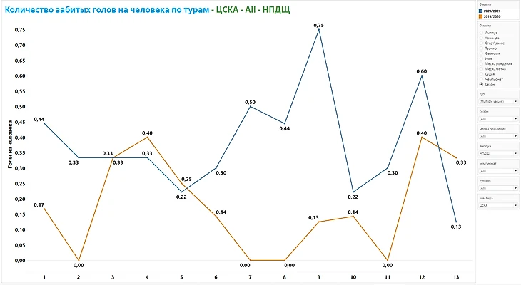 Теперь давайте посмотрим на академию ЦСКА в разрезе сезонов. Этот комментарий относится к двум графикам нижу. Синяя линяя сезон 2020/2021, оранжевая 2019/2020. Верхний график - нападающие, нижний - полузащитники. Таким образом, пытаемся понять, как меняются показатели ЦСКА со временем, да и ещё по каждому атакующему амплуа раздельно. Берём метрику кол-во забитых голов на человека, чтобы исключить колебания по кол-ву игроков и смотрим в динамике от тура к туру. Сразу видно, что в текущем сезоне дела идут у армейцев гораздо лучше. Качественная молодёжь подъехала :) Но, обратите внимание, как отличаются дела у нападающих и полузащитников. Если нападающие, действительно прибавили в этом сезоне, то вот у полузащитников не всё так однозначно! Так же, хотелось отметить интересную динамику в текущем сезоне (синяя линяя). Обратите внимание, что с 5-ого по 9-ый тур академия прибавляла, набирала ход, а потом произошёл провал. Как думаете, с чем это может быть связано?