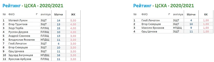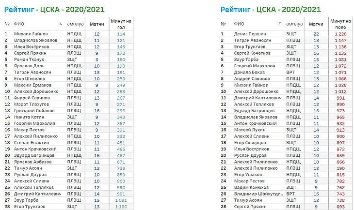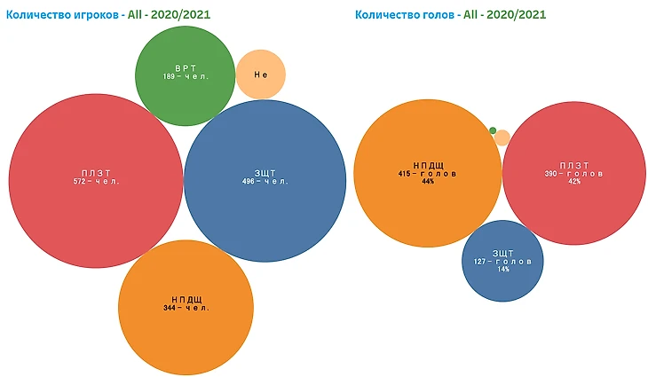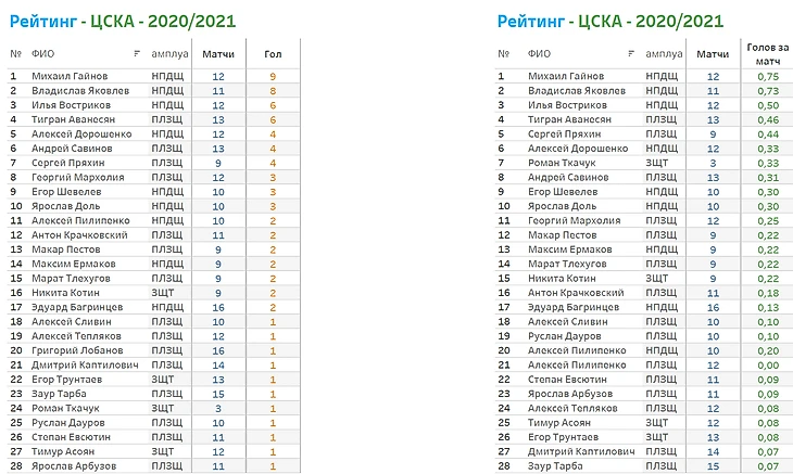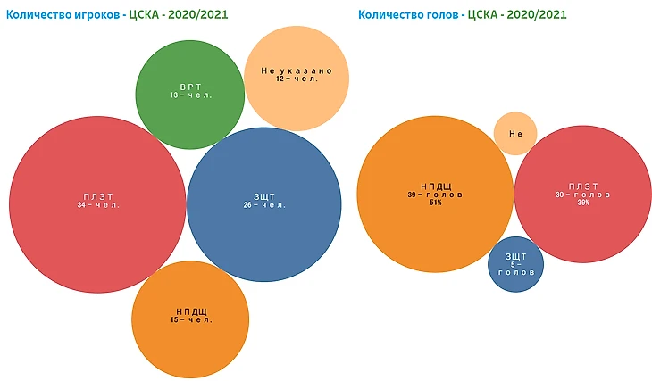По амплуа картина идентичная, что по голам, что по игрокам. ЦСКА одинаково с ЮФЛ и МРПЛ. Обратите внимание, что на нижнем графике, где данные по всем командам, у вратаря есть забитый гол, интересно кто это? :)