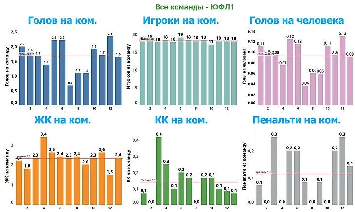 Движемся дальше, теперь по такому же принципу анализируем и сравниваем ЦСКА в ЮФЛ1. Выделяем только ЦСКА на первом графике (сверху есть соответствующая подпись) и сравниваем с показателями лиги ЮФЛ1. И, что мы видим? А то, что в ЮФЛ1 дела у армейцев не так позитивны. Как мы и предполагали, команды внутри академий могут сильно отличаться. Если в МРПЛ результативность армейцев сильно выше средней по лиге, то в ЮФЛ1 почти в два раза ниже :) В среднем ЦСКА забивает 1 гол за тур, в то время, как в лиге в среднем забивается 1,7 голов. При этом, если говорить про эффективность, а именно голы на человека, то за счёт, того, что армейцы задействуют в среднем меньше игроков в матче, метрика равна средней по лиге 0,09 и там и там. Так же, отмечаем, что ЖК у ЦСКА и в ЮФЛ1 ниже средних показателей по лиге. Ну, что уже ощутили, какой мощный инструмент статистика и анализ цифр? :) Сродни истории, как будто читаем книгу жизни академии ЦСКА, мы с вами понимаем, насколько сильно отличаются между собой команды ЦСКА в МРПЛ и ЮФЛ1.