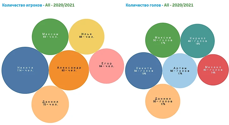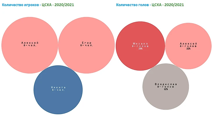 Теперь давайте посмотрим из каких игроков состоит академия ЦСКА в разрезе имён игроков. Проанализируем, какие имена чаще встречаются внутри ЦСКА и какие занимают бОльшее кол-во суммарно по всем лигам. И кто из них больше забивает голов. ЦСКА - верхний график, Тотал - нижний. Левая часть - кол-во игроков, правая - голы. В ЦСКА наибольше кол-во Алексеев - 8 чел., Егоров - 8 чел., Никит - 6 чел., при этом в МРПЛ и ЮФЛ лидеры по кол-ву игроков следующие имена: Никита, Александр, Даниил. По голам картина следующая, в ЦСКА разницу делают: Михаилы - 9 голов, Алексеи - 8 голов, Владиславы - 8 голов, а вот в целом по юношескому и молодёжному футболу: Никиты, Артёмы, Даниилы и Максимы. Если вы хотите, чтобы ваш будущий ребёнок стал лучшим бомбардиром, вы теперь знаете, как его назвать :) Шутка.