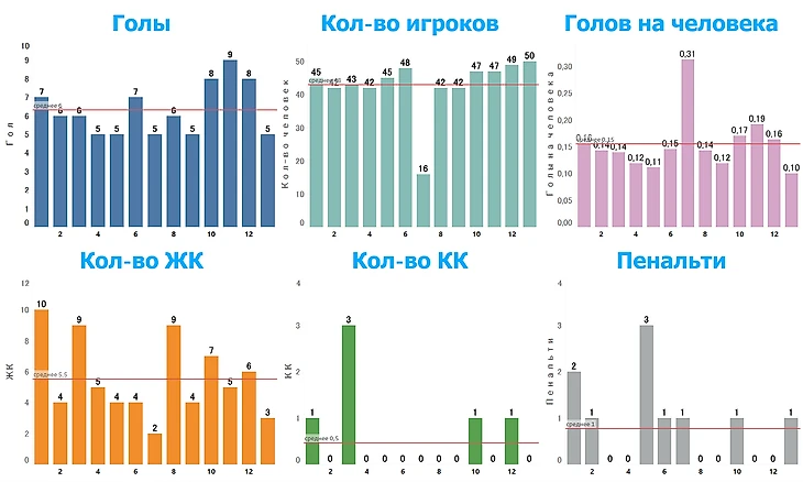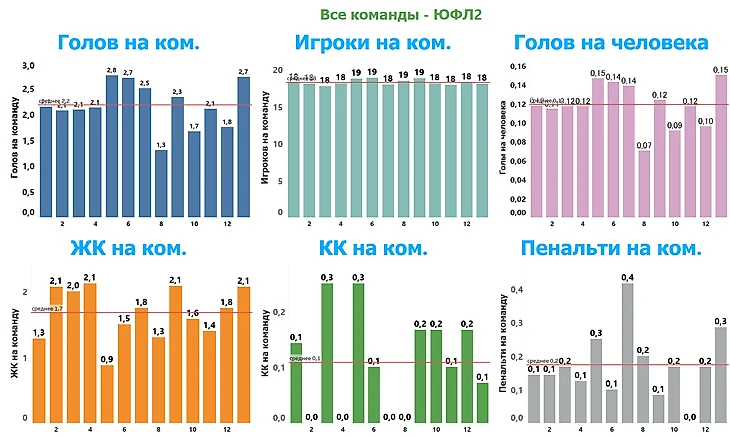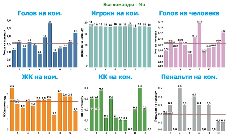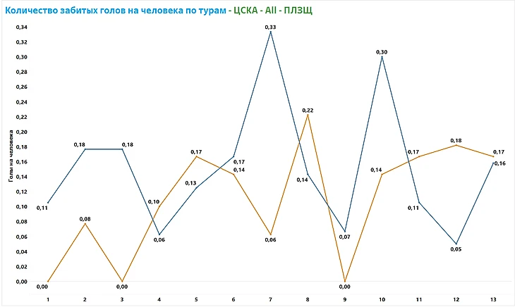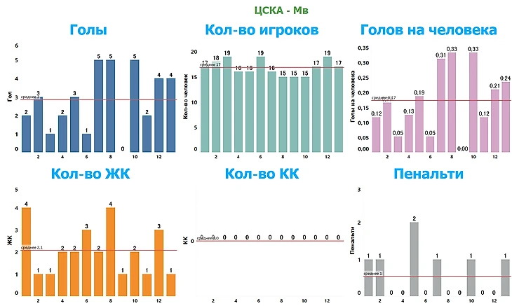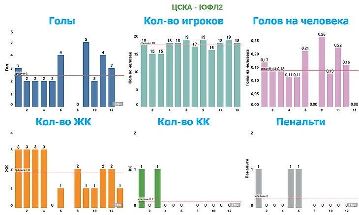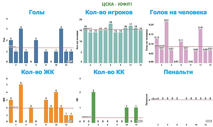 Один из наших подписчиков порекомендовал сделать более детальный анализ в разрезе лиг. Посмотреть отдельно МРПЛ, ЮФЛ1, ЮФЛ2, сравнить их между собой внутри академии, должны же они отличаться. Денис, спасибо за совет. Проверим эту гипотезу на цифрах. Итак, данный комментарий относится для двух следующих графиков сразу. Сравним показатели ЦСКА изолировано по МРПЛ с "общей температурой по больнице". Верхний график - данные только по ЦСКА, нижний - суммарно по всем командам. Таким образом, сравниваем показатели армейцев со средними по лиге. Итак, по голам: ЦСКА - в среднем 3 гола за тур, Вся лига - 1,5 гола за тур. Получается, что армейцы по МРПЛ-В в два раза результативнее остальных команд. Если посмотрите турнирную таблицу, то увидите, что ЦСКА в МРПЛ вторая команда по кол-ву забитых голов, поэтому всё объяснимо. По кол-ву задействованных игроков отклонений от средних показателей лиги нет, ЦСКА - 17 игроков, Лига - 18 игроков. Голы на человека, так же, как и абсолютные голы в два раза выше средних по лиге. По ЖК армейцы ниже лиги, 2,1 жк в среднем за тур у армейцев против 2,4 жк в среднем за тур в лиге, меньше примерно на 10%. Стоит отметить, что ЦСКА не получало КК, а учитывая, что и ЖК ниже на 10%, чем в среднем по лиге, делаем вывод, что ЦСКА в МРПЛ весьма аккуратная команда.