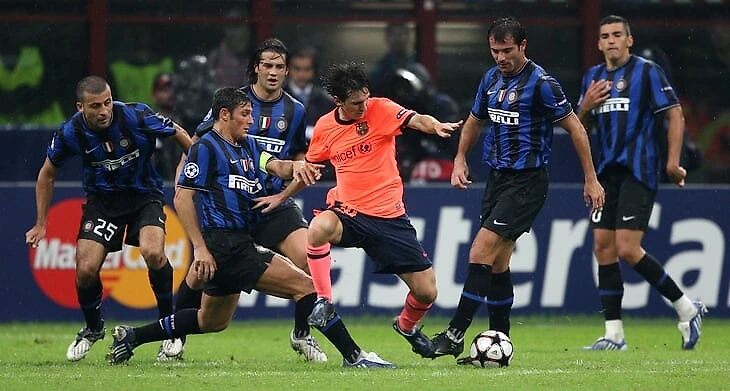 Групповой этап ЛЧ-2009/10. Лео берут в кольцо легенды «Интера», которые тогда сдержали гения. «Барса» сыграла на «Сан-Сиро» 0:0.