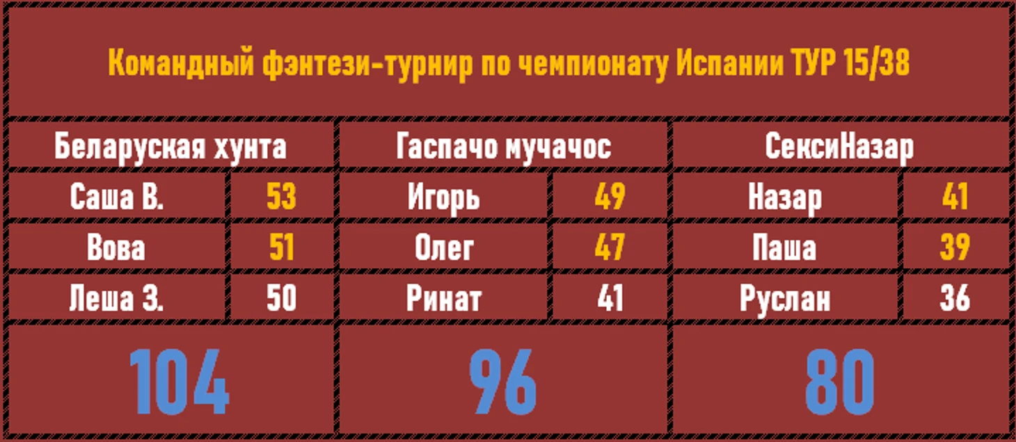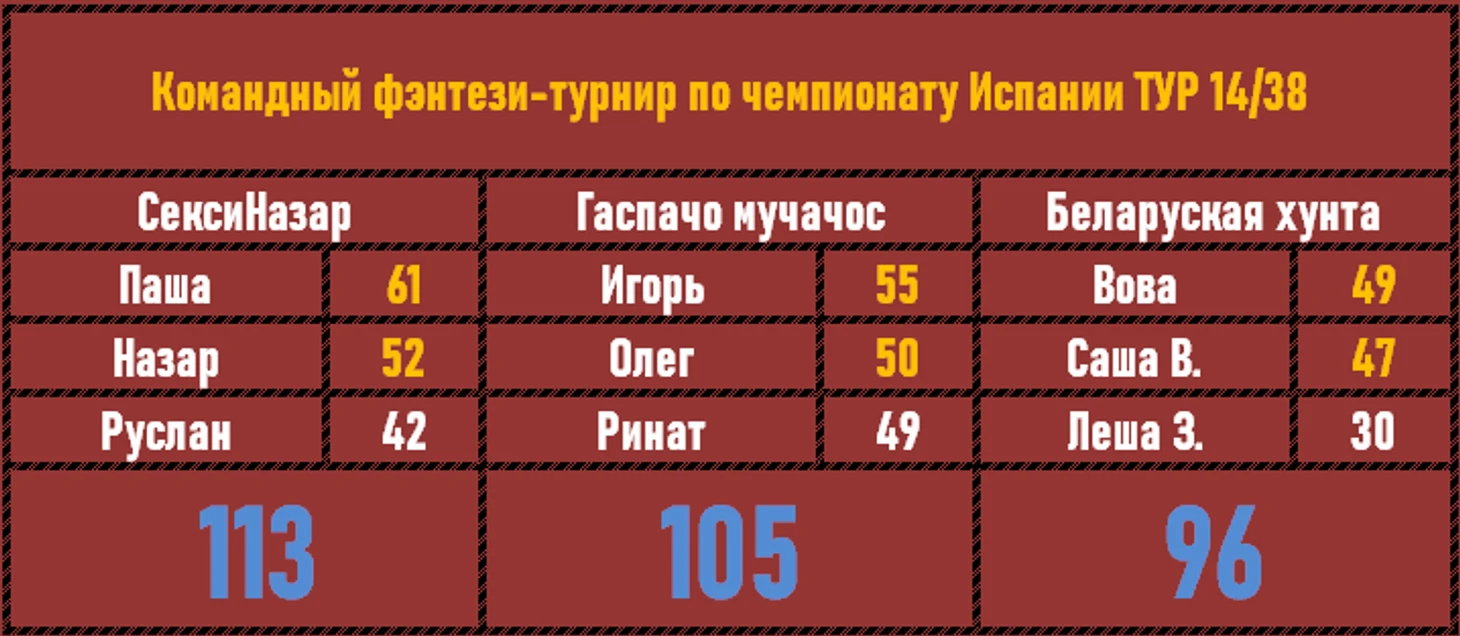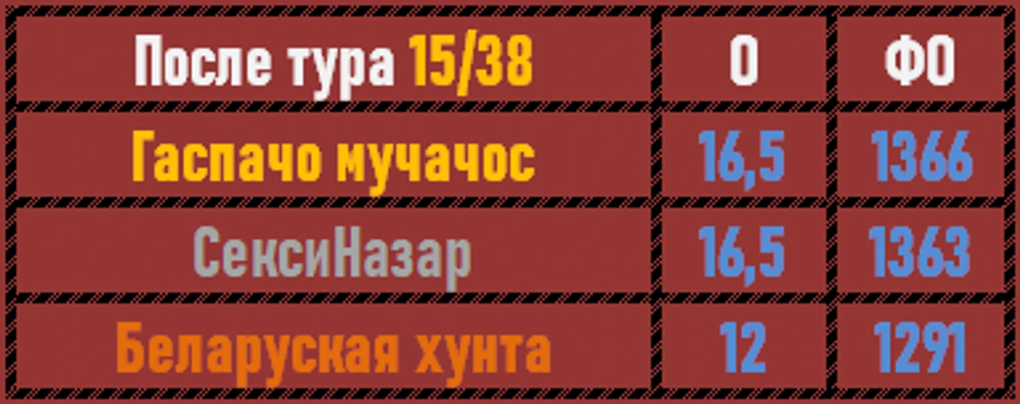 У СексиНазара - победа и третье место, у Беларуской Хунты - с точностью до наоборот, а вот Гаспачо мучачос оба раза остановились между ними. Таким образом, за 2 тура каждый из коллективов набрал по 2 балла в общей зачет. Из-за чуть большего количества ФО по итогам этого игрового отрезка, команда Гаспачо мучачос выходит в общем зачете на первое место!