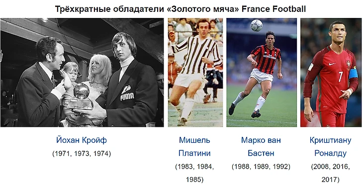 "Золотой мяч" присуждается с 1956 года. Первым победителем стал Стэнли Мэтьюз, тогда игравший в "Блэкпуле". Больше всего золотых мячей у Йохана Кройфа, Мишеля Платини, Марко ван Бастена и Криштиану Роналду. У Месси же таких мячей всего два.