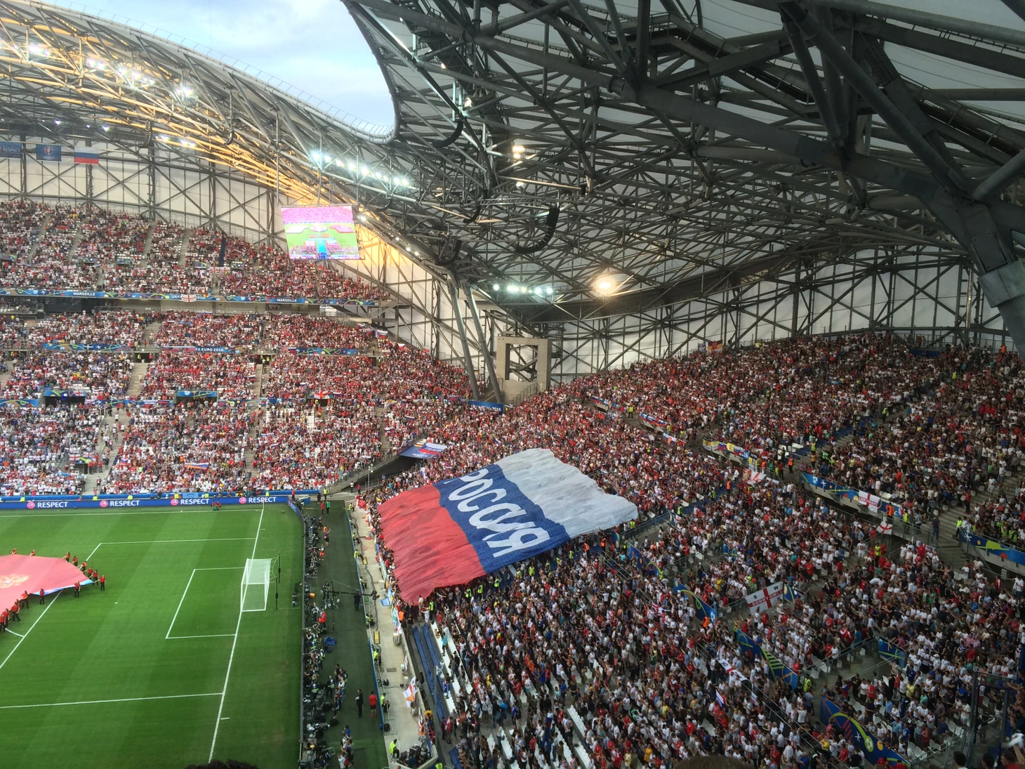 На арену отправлялись автобусами, но приходилось еще долго потом идти пешком и предложений свободных билетов было предостаточно. На стадионе практически не оказалось французов, он был полностью набит англичанами в бел-красных или бело-голубых майках, а за нами остался только «фан-сектор», тоже внушительный. Мы опять, как и в Варшаве, оказались среди болельщиков соперника и вновь, уже под привычный свист и шум, исполнили громко российский гимн. Впрочем, в отличие от Польши отдельные российские флаги мелькали на трибунах в разных местах.