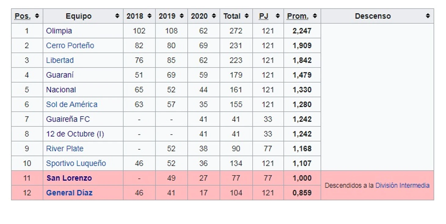 По итогам года высшую лигу должны покинуть "Спортиво Сан-Лоренсо" и "Хенераль Диас". "Генералы" из Луке не то чтобы напрашивались на вылет, но очень давно ходили по лезвию, и даже отдельные проблески в их выступлениях в "вышке" (квалификация в Копа Судамерикана по итогам 2017 и 2019 гг.) не слишком сильно поднимали коэффициент promedio. В 2020 году "Хенераль Диас" и вовсе оказался худшим по этому показателю коллективом.