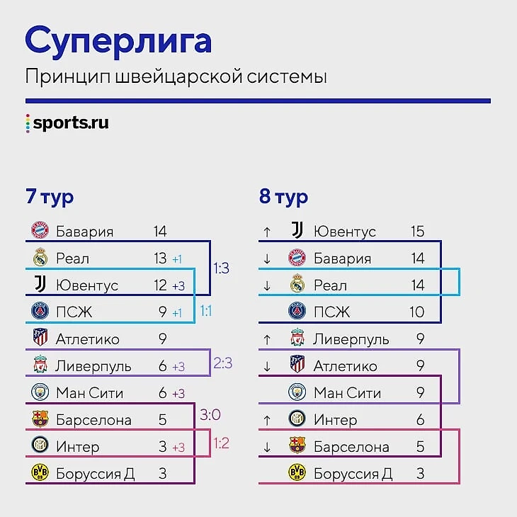 В Суперлиге конкуренция окажется еще выше – все благодаря швейцарской системе, которая чаще всего используется в шахматах. Клубы играют не по стандартной схеме «каждый с каждым дома и на выезде», а по выведенному компьютером алгоритму: фавориты – против фаворитов, аутсайдеры – против аутсайдеров (если проще, то жеребьевка проходит после каждого тура, компьютер сводит команды с похожими результатами).