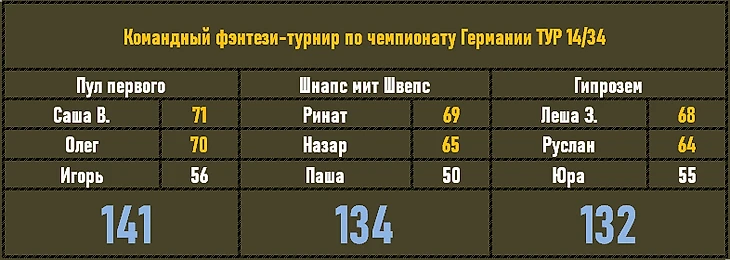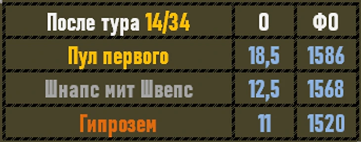Очередная победа Пул первого - третья подряд и 4-я в пяти последних турах! На этот раз блестящую игру показали Саша и Олег. Следует отметить, что и соперники отстали не очень сильно.