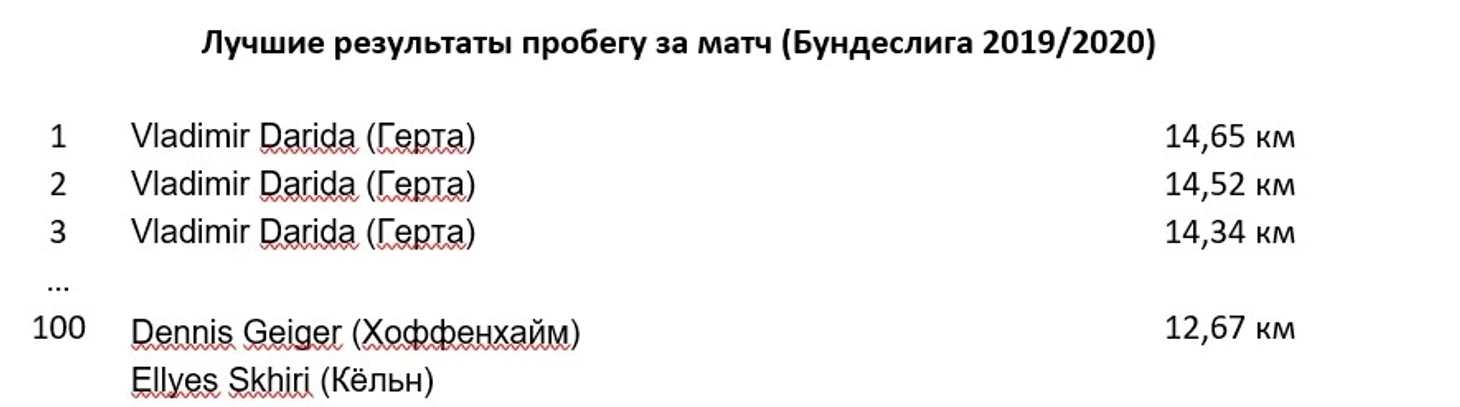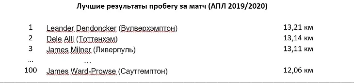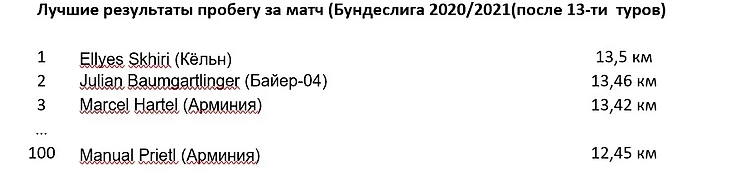 - Как в Бундеслиге. Основной массив доступной информации относится к индивидуальному и командному достижению в ходе всего чемпионата. Например, дается полный пробег в километрах за чемпионат, но не о пробеге в каждом отдельном матче. Зная количество проведенных минут на поле в течении всего чемпионата можно пересчитать “средний пробег/90 мин”.