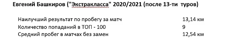 В сезоне 2020/2021 Башкиров провел 13 матчей в чемпионате, из них девять отыграл полностью. Каждый из этих матчей попал в ТОП-100 по “пробегу за матч”. Лучший же результат чемпионата - 13,14 км за матч – зафиксирован в 5-м туре. Он, естественно, за главным героем этой заметки.