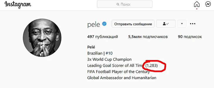 «Абсолютный лидер всех времен по количеству забитых мячей (1,283)» – такая запись появилась в Instagram-аккаунте Пеле.