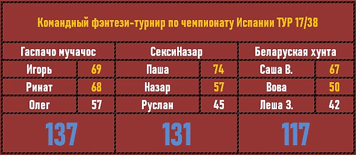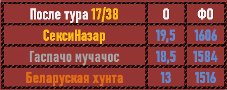 По итогам 17-и туров СексиНазар имеет небольшое преимущество, но ГМ не собирается сдаваться. Беларуская Хунта отстает, но еще постарается ввязаться в борьбу за победу в команднике.