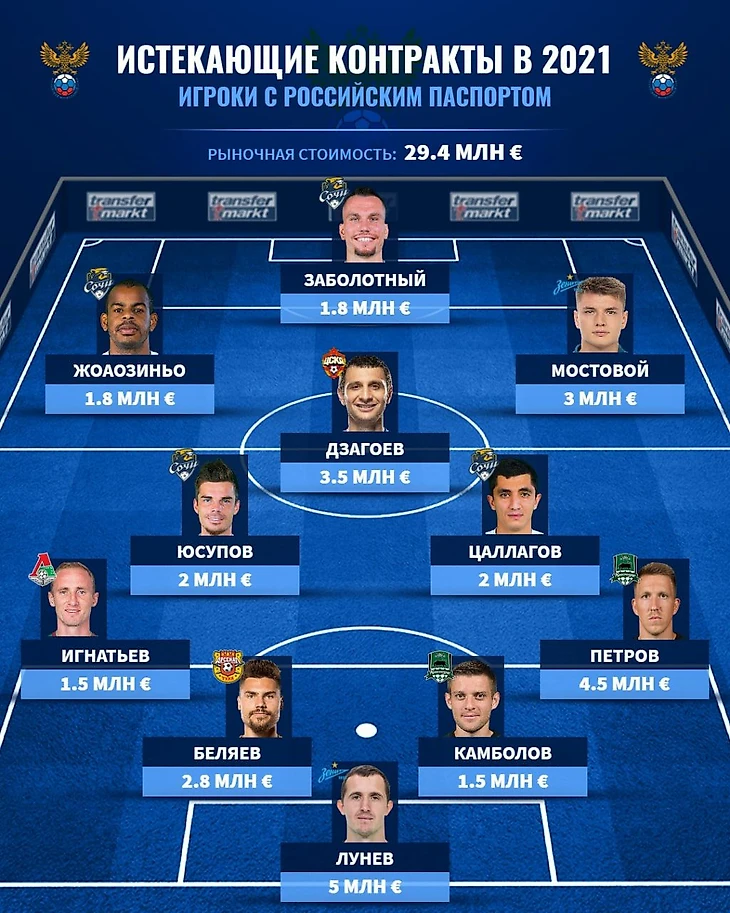Трансфермаркт опубликовал символическую сборную игроков-россиян, которые летом могут стать свободными агентами. Итак,