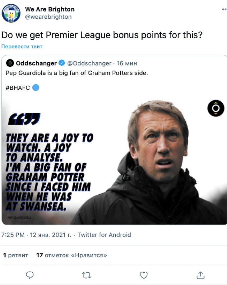 "Начислит ли Премьер-Лига бонусные очки за столь лестный отзыв?" - вопрошают фанаты. Действительно, это все конечно очень мило, вежливо и бла-бла-бла, только последние три матча против "Манчестер Сити" "Брайтон" проиграл с общим счетом 13-1.