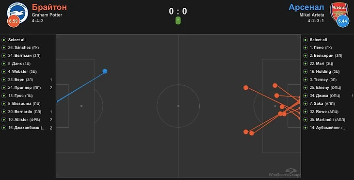 Глядя на эту картинку, может показаться, что "Арсенал" возили. Не возили. "Брайтон" был содержательней, безусловно, но нужно понимать, что такое удары "Брайтона" - обычно это или заблокированные, или по воробьям, или неловкие извиняющиеся пинки по мячу в сторону ворот. «Брайтон» неплохо плетет кружева своих атак, но когда доходит дело до решающего удара - получается жидко. Из этих 8 ударов по-настоящему опасным был только один. Как итог, этот матч был проигран 0-1.