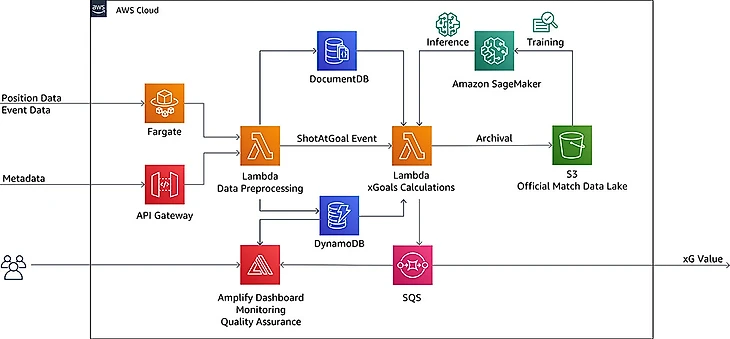 Мы используем две базы данных для хранения статистики матчей: Amazon DynamoDB, база данных «ключ-значение», и Amazon DocumentDB (с совместимостью с MongoDB), база данных документов. Последний позволяет легко запрашивать и индексировать данные о местоположении и событиях в формате JSON с вложенными структурами. Это особенно удобно, если рабочие нагрузки требуют гибкой схемы для быстрой итеративной разработки. Для централизованного хранения официальных данных о матчах мы используем Amazon Simple Storage Service (Amazon S3). Amazon S3 хранит исторические данные за все дни матчей, которые используются для итеративного улучшения модели xGoals. Amazon S3 также хранит метаданные о производительности модели, мониторинге модели и показателях безопасности.