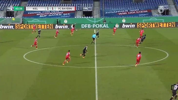 В случае, если «Бавария» разыгрывала мяч используя крайних защитников, вингеры «Хольштайна» также подключались в прессинг, выдвигаясь на фулбэков. Вингеров мюнхенцев на себя забирали крайние защитники Киля. При этом не забывали и про опорников, их чуть ли не персонально держали центральные полузащитники хозяев.