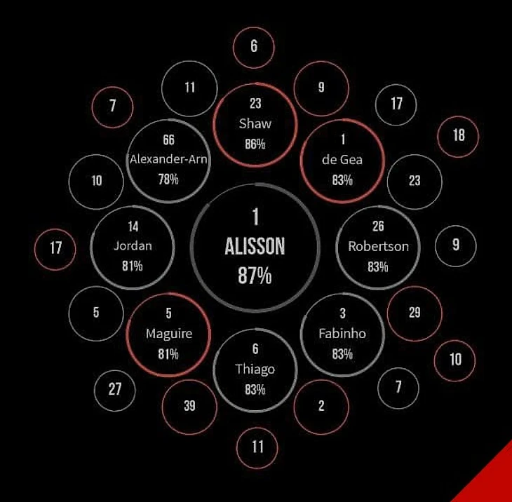 Проценты в обеих командах только у игроков обороны; первое место у Алисона за 2 сейва в концовке.