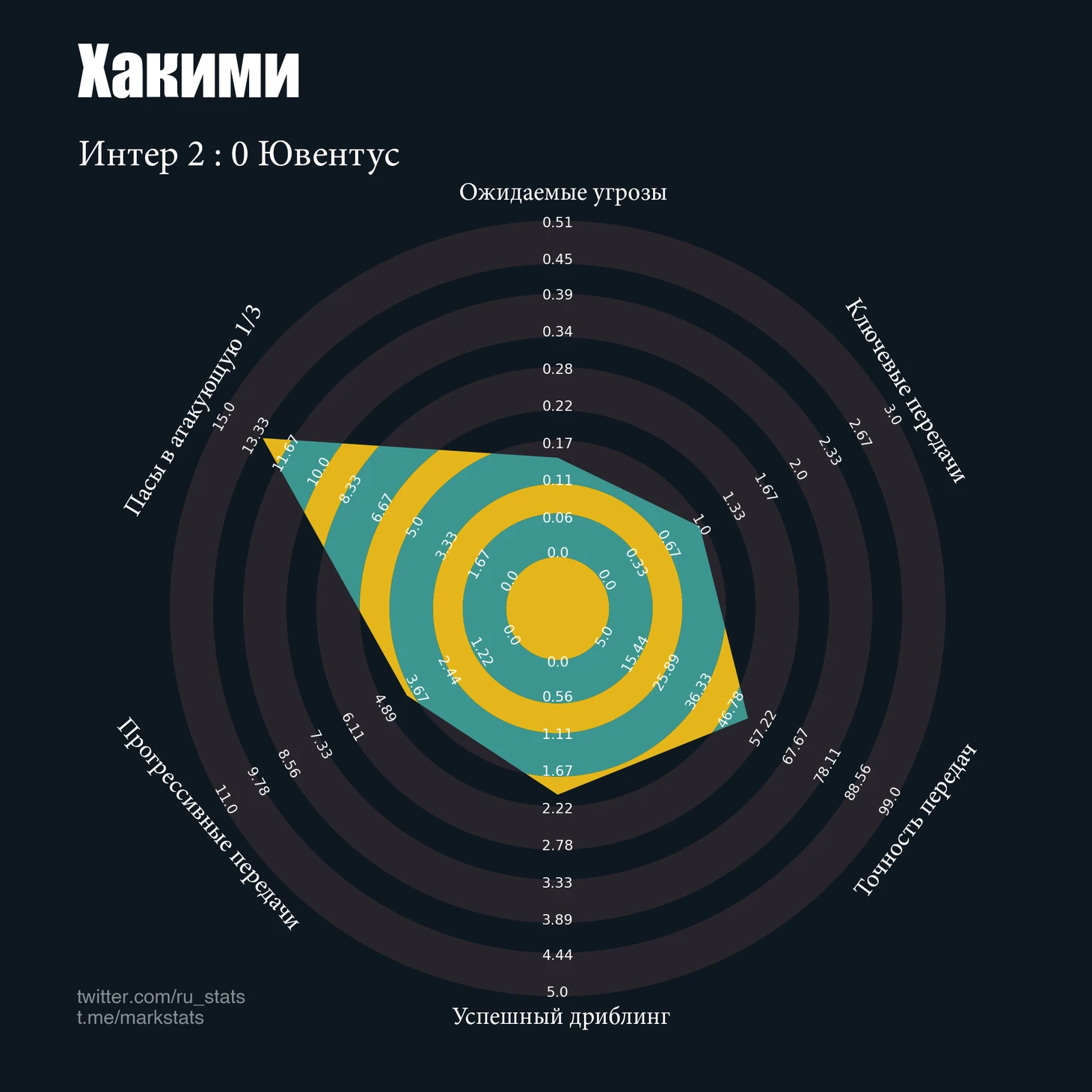 Хакими совершил: 2 возврата мяча, 52 успешных передач из 59 попыток (1 под удар, 4 с продвижением, 13 на трети соперника) и 2 успешные обводки: