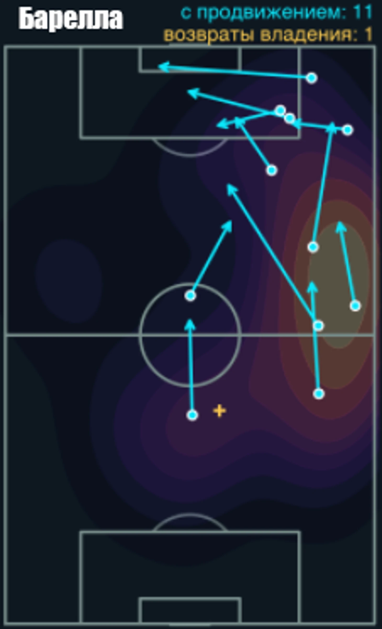 Бастони. Кроме своих прямых обязанностей по обороне (6 выносов) и страховке Янга, прибавил изумительный пас на Бареллу. Смотрим тепловую карту.