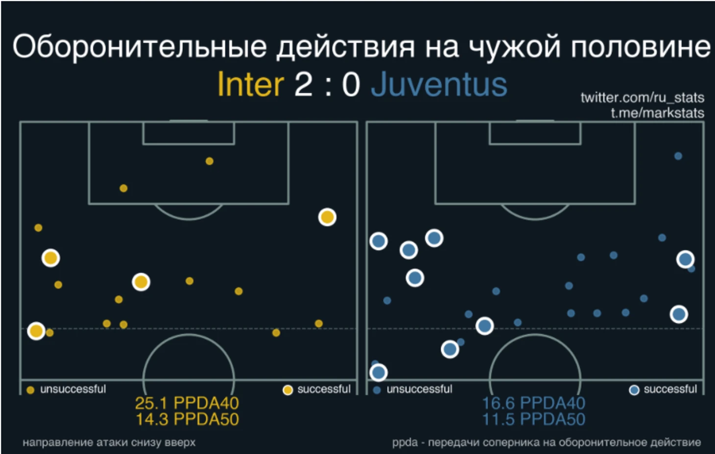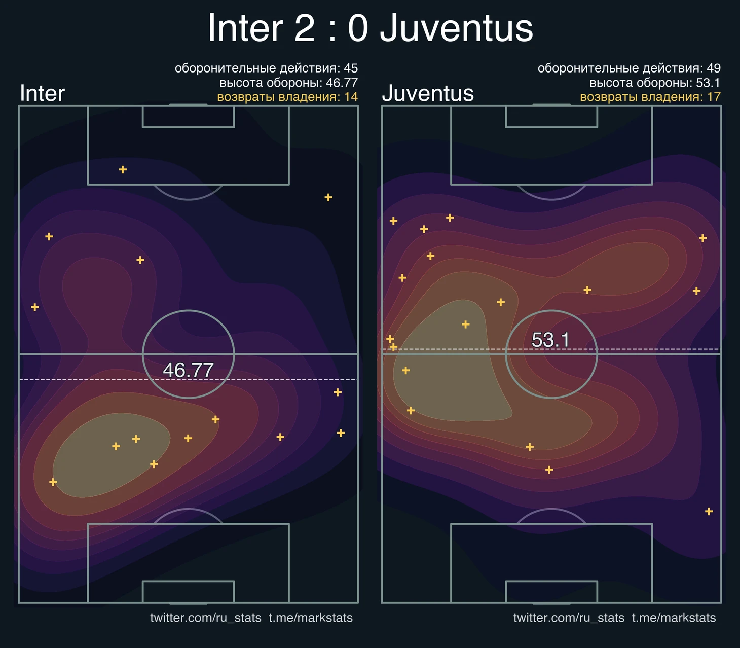 Проблему подтверждают и цифры, средняя высота оборона "Ювентуса" 53.1 м., а "Интера" 46.7 м. Высокоподнятая линия обороны и 9 отборов на чужой половине не исправили качество прессинга туринцев: