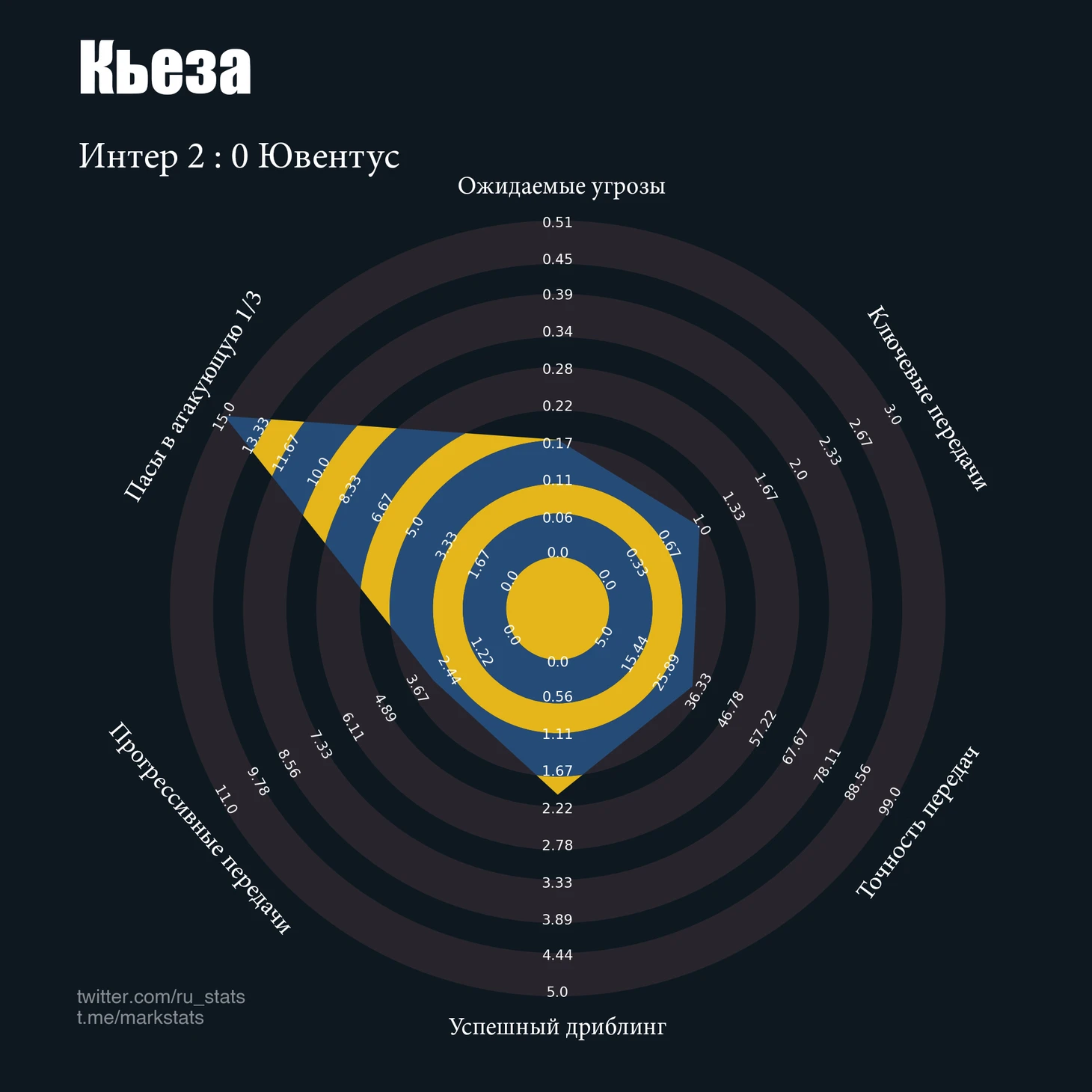 У "Ювентуса" светлым пятном в атаке был Федерико Кьеза отдал 1 пас под удар, 3 передачи с продвижением, 15 передач на трети соперника и выполнил 2 успешные обводки, вот график его действий: