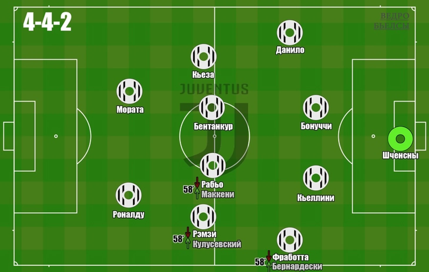 Так или иначе, вносить корректировки пришлось, Пирло провел замены через шесть минут после пропущенного мяча, сменив Фработту из -за травмы, выпустив Бернардески, и убрал Рабьо с Рэмзи (вместо них вышли Макенни и Кулушевски). Формация перешла во что - то среднее между 4-2-4 с Макенни и Кулушевски в центре, и 3-5-2 с Кьезой и Бернардески в роли латералей, при позиционной обороне все осталось неизменно, 4-4-2.