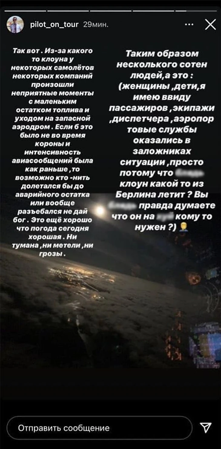 Пырков в сторис инстаграма опубликовал фотографию из кабины пилота, написав, что «из-за какого-то клоуна» у некоторых самолетов, которые садились на запасном аэродроме, могло закончиться топливо. Скриншоты из инстаграма Пыркова, у которого в профиле указано, что он поклонник «Спартака», разлетелись по социальным сетям. Пилот затем закрыл свой аккаунт.