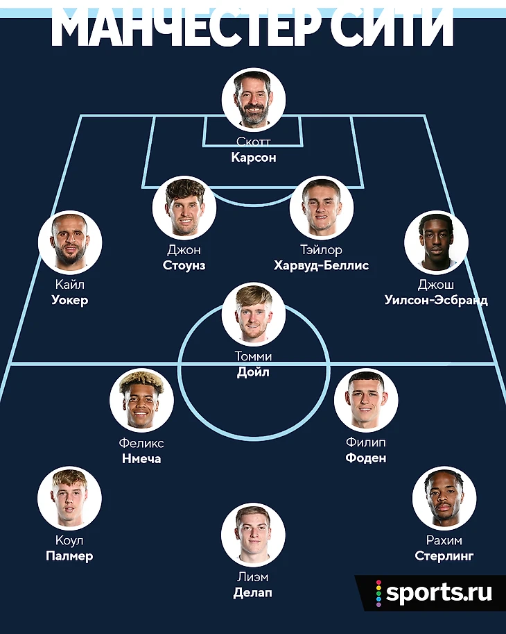 Если «Манчестер Сити» придется играть только британцами, то от основного состава в команде останутся только Уокер, Стоунз, Фоден и Стерлинг. Место бразильца Эдерсона в воротах займет ветеран Скотт Карсон. Остальные позиции займут молодые парни из дубля.