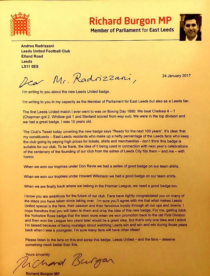 Кто эти 10 тысяч человек, осталось загадкой, потому что через два часа после анонсирования логотипа петиция против него собрала уже 20 тысяч подписей, а к концу дня таковых было уже 77 тысяч. Надо понимать, что по британским законам, если под петицией подпишется 100 тысяч человек, то она выносится на обсуждение в Палате общин парламента. Впрочем, парламент сам пришёл к клубу: в первый же день его представитель от округа Лидс написал в правление «Белых» открытое письмо с призывом отозвать реформу.