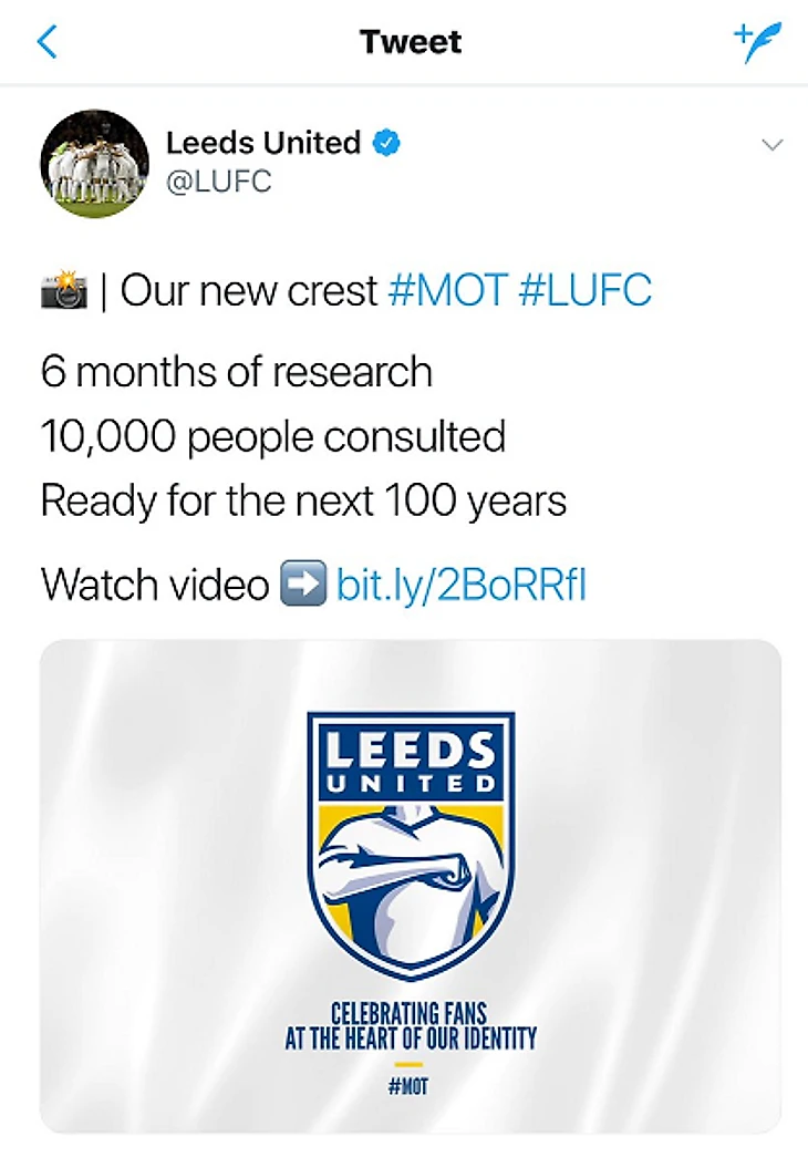 24 января 2018 года «Лидс» представил новую эмблему, желая приурочить ребрендинг к 100-летнему юбилею клуба. По заявлению клуба новый логотип появился на свет после 6 месяцев разработки, в рамках которой дизайнеры опросили 10 тысяч человек.